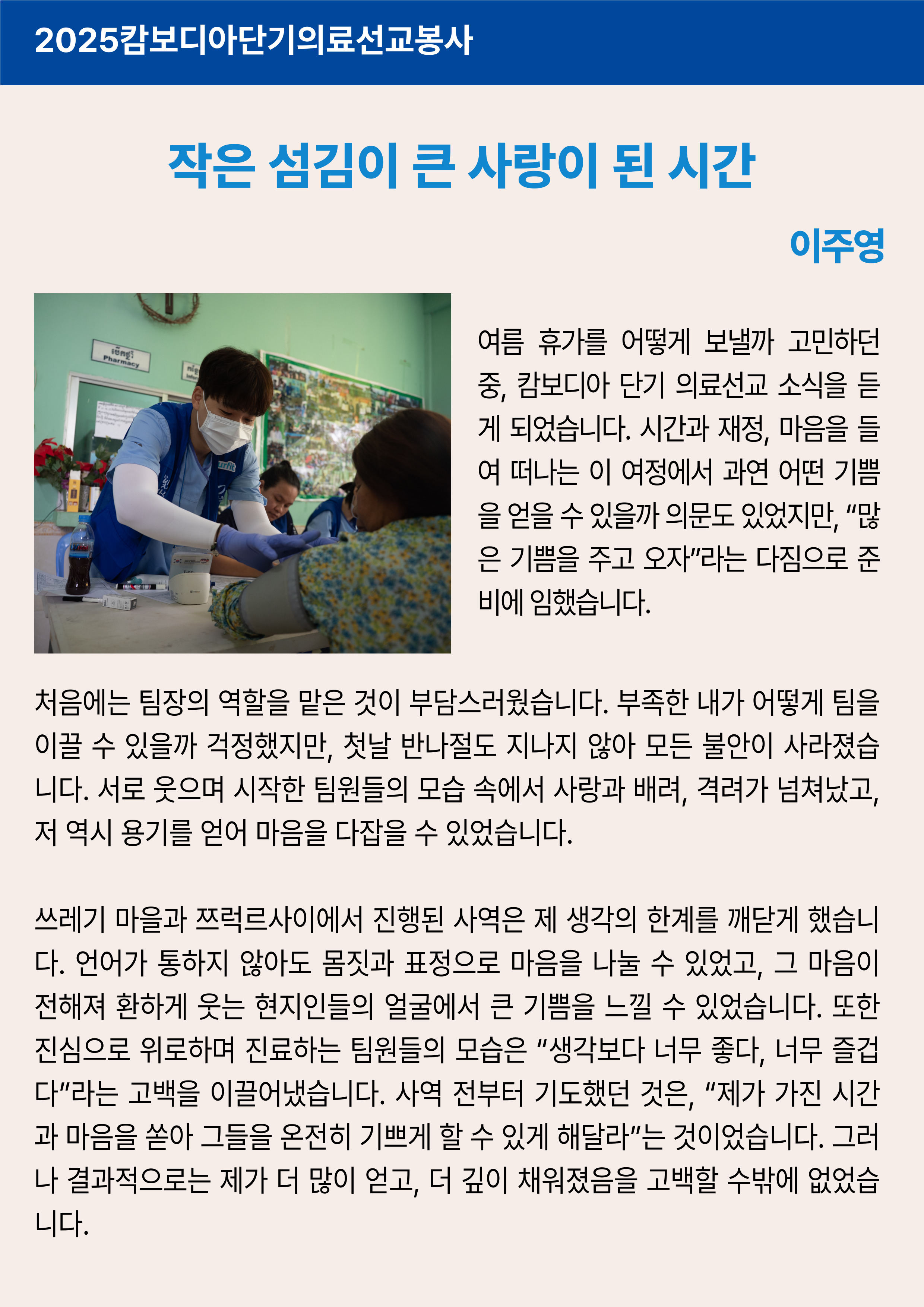 ¿ÃÇØ ¿©¸§, ¡°¸¹Àº ±â»ÝÀ» ÁÖ°í ¿ÀÀÚ¡±´Â ´ÙÁüÀ¸·Î įº¸µð¾Æ ´Ü±â ÀÇ·á¼±±³¸¦ ´Ù³à¿Ô½À´Ï´Ù. ºñ·Ï ªÀº ½Ã°£À̾úÁö¸¸, ±× ¾È¿¡¼ ¿ì¸®´Â ³ª´®ÀÌ ¾ó¸¶³ª Å« »ç¶ûÀÌ µÇ´ÂÁö¸¦ ±íÀÌ ¹è¿ü½À´Ï´Ù. Áø·áÇϰí, ¾àÀ» ³ª´©°í, ¾ÆÀ̵é°ú ÇÔ²² ¶Ù³î¸ç ¿ôÀ» ¶§¸¶´Ù ¿ì¸®º¸´Ù ÈξÀ ´õ ¸¹Àº °ÍÀ» Áֽô Çϳª´ÔÀ» ´À³¥ ¼ö ÀÖ¾ú½À´Ï´Ù. ÀÇ·á ºÀ»ç¿´Áö¸¸, ±×°÷¿¡¼ ¸¶ÁÖÇÑ È¯ÇÑ ¹Ì¼Ò¿Í µû¶æÇÑ ´«ºûÀº ¿ÀÈ÷·Á ¿ì¸®ÀÇ ¸¶À½À» Ä¡À¯Çß½À´Ï´Ù. ¾ð¾î´Â ÅëÇÏÁö ¾Ê¾Æµµ, ¼ÕÀ» Àâ¾ÆÁÖ´Â ¼ø°£ ¸¶À½ÀÌ ÅëÇß½À´Ï´Ù. ¼·ÎÀÇ ºÎÁ·ÇÔÀ» ä¿öÁÖ¸ç ³¡±îÁö ¼¶±ä ÆÀ¿øµéÀÇ ¸ð½ÀÀº ¡°WELL¡±À̶ó´Â À̸§ ±×´ë·Î, »ç¶û°ú ºûÀÇ »ù¹°ÀÌ µÇ¾î Èê·¯°¬½À´Ï´Ù. ÀÌ ½Ã°£Àº ´Ü¼øÇÑ ºÀ»ç°¡ ¾Æ´Ï¶ó, ¡®³»°¡ °¡Áø ½Ã°£°ú ¸¶À½À» ¿ÂÀüÈ÷ µå¸± ¶§ ±×ºÐÀÇ »ç¶ûÀÌ ¾ó¸¶³ª dz¼ºÇÏ°Ô Èê·¯°¡´ÂÁö¡¯¸¦ ±ú´Ý´Â ¿©Á¤À̾ú½À´Ï´Ù. µ¹¾Æ¿Â Áö±Ýµµ, ±× ¿ôÀ½°ú ´«ºûÀÌ ¿©ÀüÈ÷ ¸¶À½À» ¿ï¸³´Ï´Ù. We served. We received. We were loved. ±×°÷¿¡¼ ³ª´« »ç¶ûÀÌ ¿ì¸®ÀÇ ÀÏ»ó ¼Ó¿¡¼µµ °è¼Ó À̾îÁö±æ ¼Ò¸ÁÇÕ´Ï´Ù. |